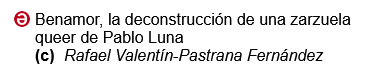 Como concluye Ignacio Jassa, Benamor «no puede considerarse una obra transgresora ya que todos aquellos elementos que perturban los modelos de identidad de género y orientación sexual socialmente aceptados acaban, tras un equilibrio inestable, conduciéndonos de forma aleccionadora a lo normativo. Pero los autores emplean tres actos completos en llevarnos a la senda de la cisexualidad y del amor heterosexual. Por el camino jugarán con el texto dramático y musical creando situaciones en las que podremos entrever amores homoeróticos sostenidos argumentalmente (el de Juan de León y Darío) o físicamente (el de Nitetis y Benamor) y sobre todo nos forzarán a meternos en la piel de dos personas transgénero. Tuvo que ser una artista femenina llegada de un país lejano y encarnadora por excelencia de la alteridad quien se convirtiera en el acicate de unos creadores patrios para que esta pequeña-gran proeza se tornara en 1923 (y se torne también hoy) en una regocijante y estimulante realidad». Demos en definitiva la bienvenida a esta sorprendente opereta queer (adjetivo inglés que significaba «extraño» y «poco usual» pero que ahora ha devenido en globalista, pasando a emplearse para designar a todas aquellas personas que no se sienten identificadas con una identidad de género completamente masculina o femenina) tras un paréntesis de noventa y ocho años. Inexplicable si tenemos en cuenta que Benamor cosechó un gran éxito, el mayor de la carrera de Pablo Luna según las crónicas del momento, alcanzando ciento cuarenta y seis representaciones desde mayo a noviembre de 1923 y llegándose a realizar cinco grabaciones fonográficas de la zarzuela. Y lamentable, porque no estamos en España sobrados precisamente de obras maestras aparte de las habituales del repertorio y deberíamos estar orgullosos de que en nuestro patrimonio cultural se encuentren aún maravillas olvidadas como esta Benamor de Pablo Luna que nos redescubre de nuevo el equipo del Teatro de la Zarzuela.