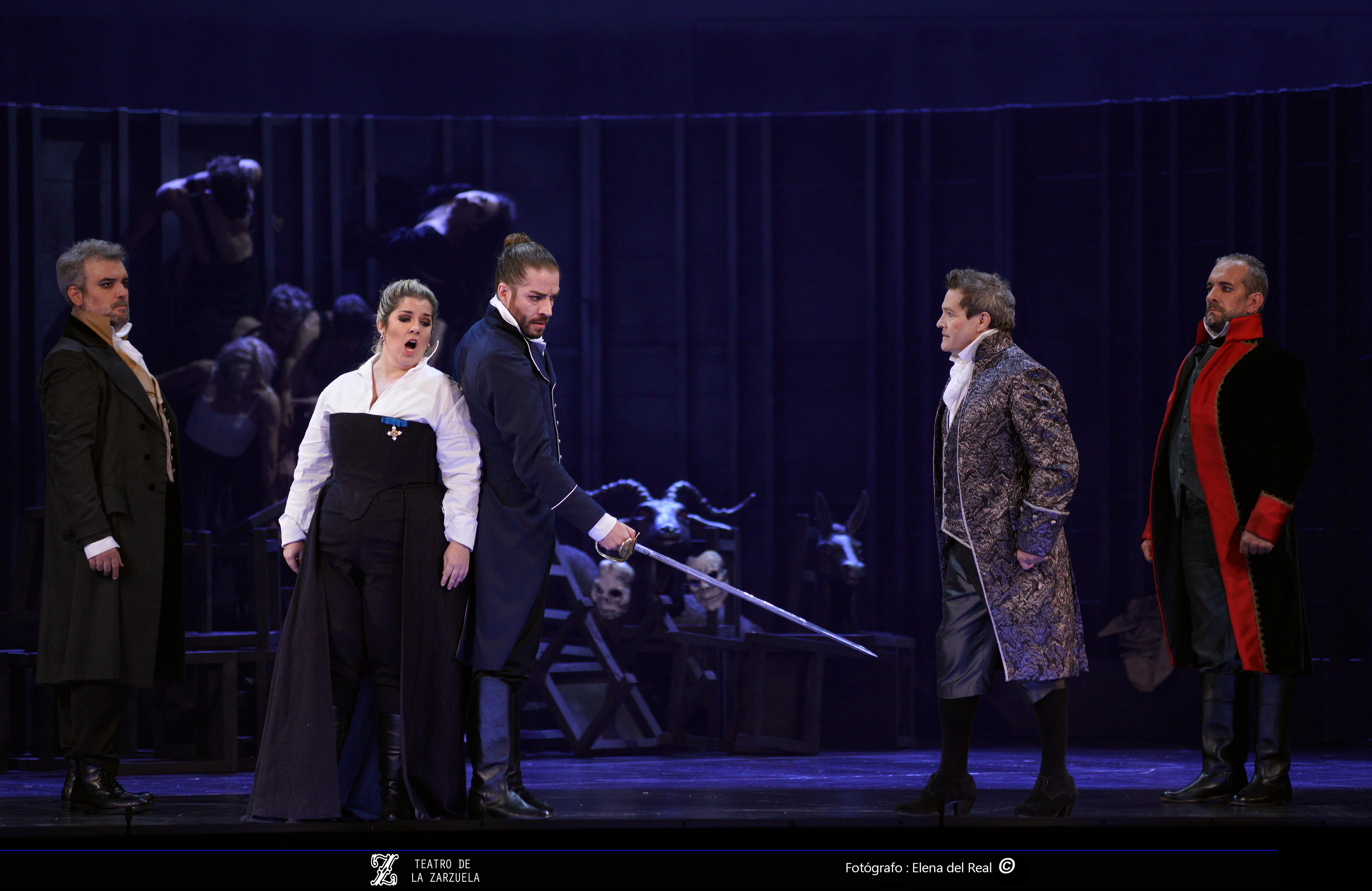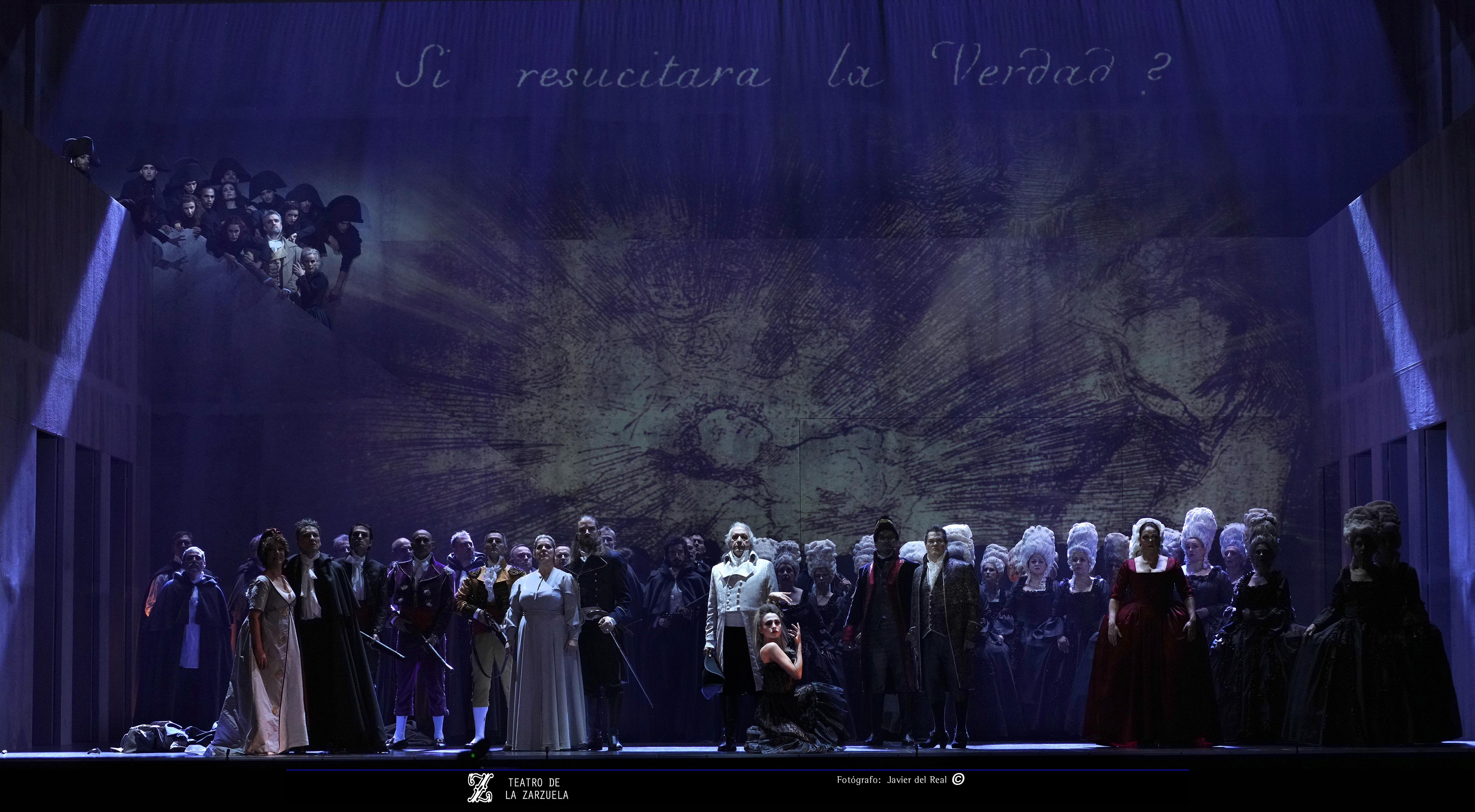 Consolidada como una de las joyas del género desde su aclamado estreno el 22 de diciembre de 1864, precisamente en el Teatro de la Zarzuela, Pan y toros, que nos llega en edición crítica de Emilio Casares y Xavier de Paz, cuenta con la dirección musical de Guillermo García Calvo, la escenografía y el vestuario están firmados por Ana Garay, la iluminación es de Juan Gómez Cornejo, la coreografía de Manuela Barrero y la vídeo-escena corre a cargo de Álvaro Luna y Elvira Ruiz Zurita. Del primer reparto de estas representaciones de Pan y toros hay que destacar a Yolanda Auyanet (demasiado tendente a los estruendosos agudos y a los gorgoritos, como Doña Pepita), Carol García (que ya encandiló al público madrileño como Maya en el reciente Don Gil de Alcalá, ahora en el papel de Princesa de Luzán), Borja Quiza (al que ya hemos comprobado que le va como un guante el barberillo Lamparilla, esta vez protagoniza con suficiencia al Capitán Peñaranda), Milagros Martín (una veterana de la lírica española, ahora como la episódica Tirana), Enrique Viana (corto de voz, pero con una bis cómica al alcance de muy pocos y muy metido en el personaje liante y zascandil del Abate Ciruela, un personaje heredado del Don Basilio del Barbero de Rossini, compositor al que Barbieri admiraba) y Gerardo Bullón (todo un lujo como Goya). Y a destacar las interpretaciones de Carlos Daza, Pablo Gálvez y José Manuel Díaz, muy dignos como los toreros «Pepe-Hillo», Romero y Costillares, respectivamente. Mención especial merece la dirección escénica de Juan Echanove que, en su primera incursión como regista de zarzuela, pone el acento en el mundo goyesco, pero no en el de coloristas romerías y vistosas chulapas, sino en su vertiente más oscura y pesimista, con predominio del negro en los ropajes y con diseños de vestuario importados de la vecina Francia y de su reciente y sangrienta Asamblea revolucionaria, con citas a La Marsellesa incluida, en presagio de los ominosos tiempos que estaban por llegar a suelo español con los desastres de la Guerra de la Independencia. La formación audiovisual de Echanove queda patente en su buen gusto a la hora de componer el movimiento interno de las escenas y en la cuidada planificación de los encuadres visuales, algunos tan impresionantes y conseguidos como los finales de los dos primeros actos.