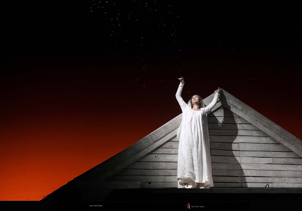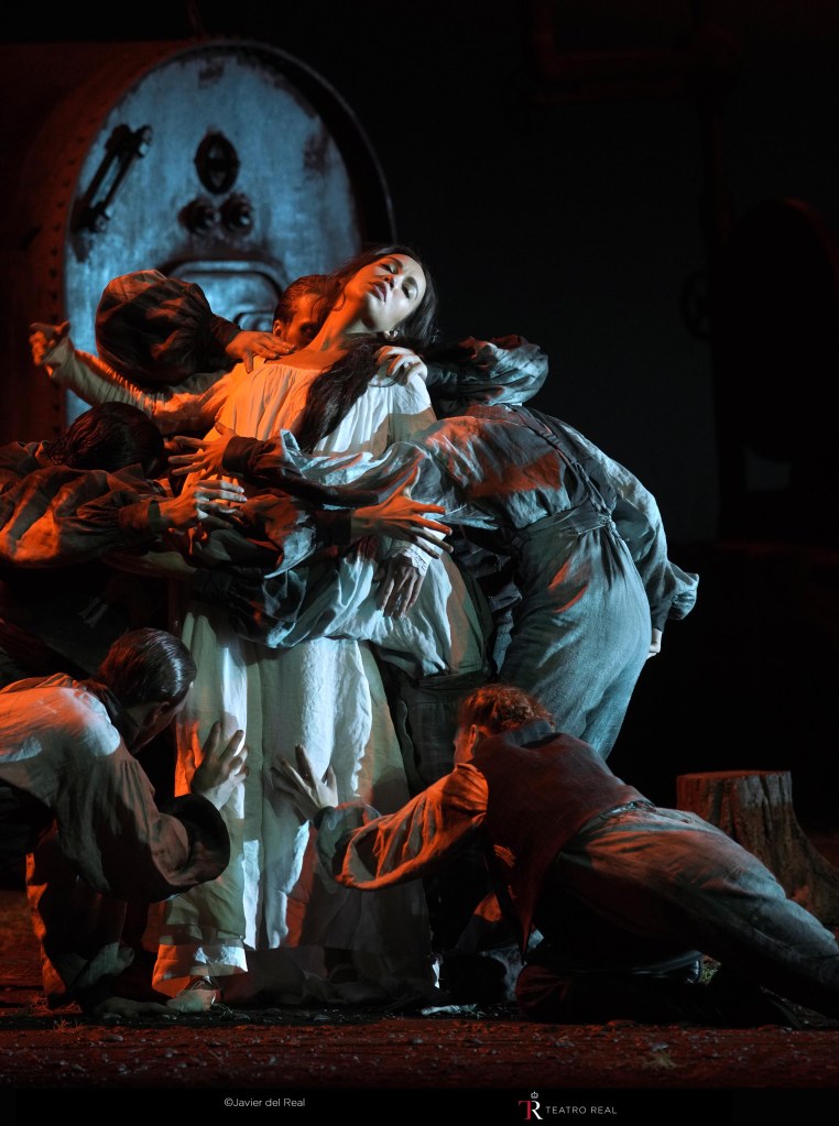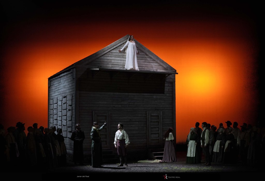 La dirección escénica recae en Bárbara Lluch, que sitúa la acción en un entorno rústico dominado por la religión y que, por el vestuario de Clara Peluffo, bien podría ser la calvinista, pero también las fanáticas comunidades cuáqueras de Norteamérica, lo que no viene mal para comprobar que en siglos pasados no sólo en España hubo intransigencia religiosa. La confusa y discutible presencia del cuerpo de baile en los prólogos de cada uno de los dos actos quizá sea por el origen del argumento original en el que está basada la ópera (un ballet-pantomima con argumento de Eugène Scribe y música de Ferdinand Hérold), aunque también es de suponer que los coreógrafos Iratxe Ansa e Ígor Bacovich tratan de materializar los fantasmas de Amina cuando entra en estado de sonambulismo. En declaraciones a la prensa, Lluch ha mostrado su indignación ante el precipitado final feliz de la ópera, cuando la protagonista perdona los desplantes de su prometido y del resto de sus vecinos calvinistas y se casa con Elvino: «¿Se casan? ¡Por encima de mi cadáver!«, reservándole Lluch a Amina una discutida reacción al final de la ópera. Afortunadamente poco puede hacer la hija de Alicia Moreno y nieta de Núria Espert aparte de dar instrucciones a la soprano para que la protagonista se despoje de su velo nupcial y lo lance lejos a la vez que le dedica un gesto de despedida burlón (un «Ahí os quedáis») al novio y a los habitantes de la aldea suiza: afortunadamente nadie, de momento, se ha atrevido a cambiar los textos de una ópera como La sonnambula. Tratar de alterar, por ingeniería social, moda sobrevenida o imposición de la ideología dominante, los argumentos y libretos escritos siglos atrás por hombres del talento de Romani y Bellini es un esfuerzo baldío que sólo conduce a la melancolía. El público, a estas alturas de la ópera, ha podido durante dos horas y veinte escuchar y ver (y leer en los indispensables subtítulos: cuántas óperas no se han podido entender porque los teatros no habían implementado aún esta valiosísima herramienta) la mezquindad del mundo protestante y ya tiene elementos de juicio suficientes para formarse el criterio de que Amina es una víctima y empatizar con ella; y que, en cambio, todo su entorno es tóxico: su novio es un inseguro y un celoso; Teresa, su madre adoptiva, le da la espalda y no la cree por miedo al qué dirán; el Conde Rodolfo, que puede confirmar que todo ha sido un malentendido, se hace rogar, aparte de que ha estado a punto de aprovecharse del sonambulismo de Amina; su amiga Lisa es una envidiosa que, a la primera ocasión (bueno, a la segunda, porque también flirtea con Rodolfo), se ofrece al despechado Elvino; los aldeanos la tratan con desprecio y agresividad, etc. Por eso esta ópera se llama La sonámbula y no Lady Amina del bosque de Birnam ni Lady Amina del distrito de Mtsensk: Amina no se mueve ni por el odio ni por el rencor ni por la venganza. Su amor es incondicional y sin contraprestaciones y con él redime las limitaciones y defectos de las personas de su entorno. Y ése es su triunfo y no reivindicaciones fuera de tiempo y lugar.