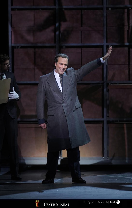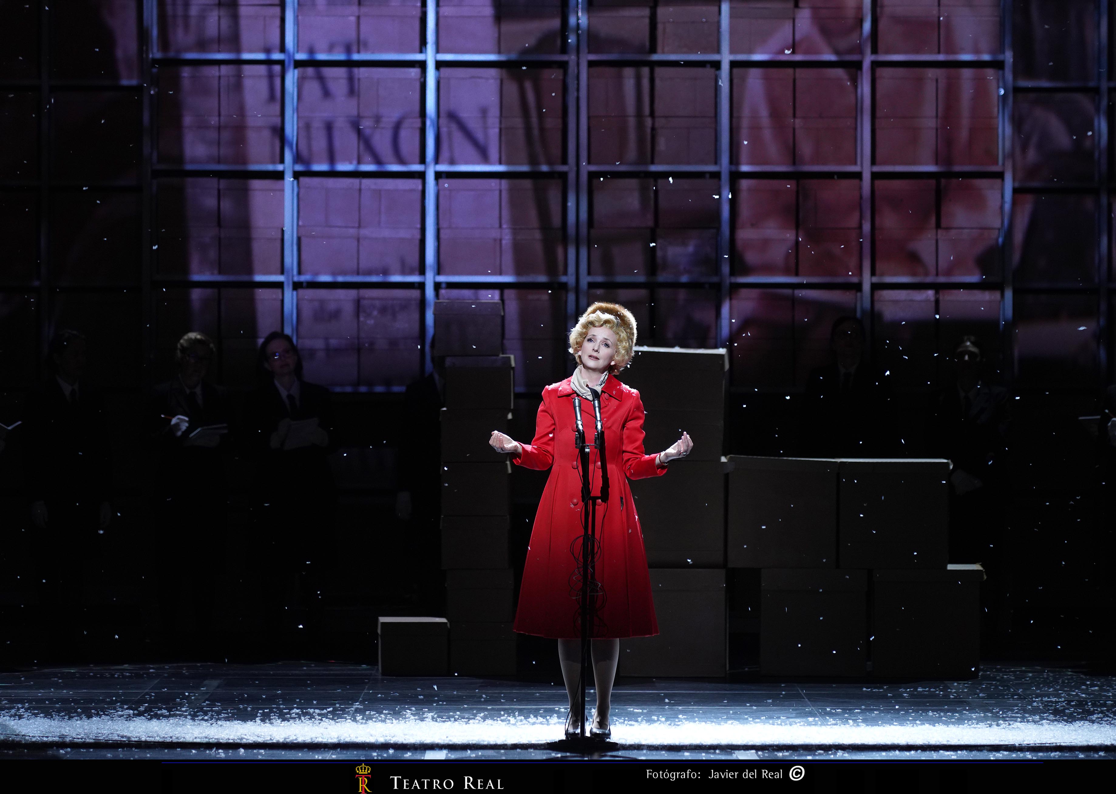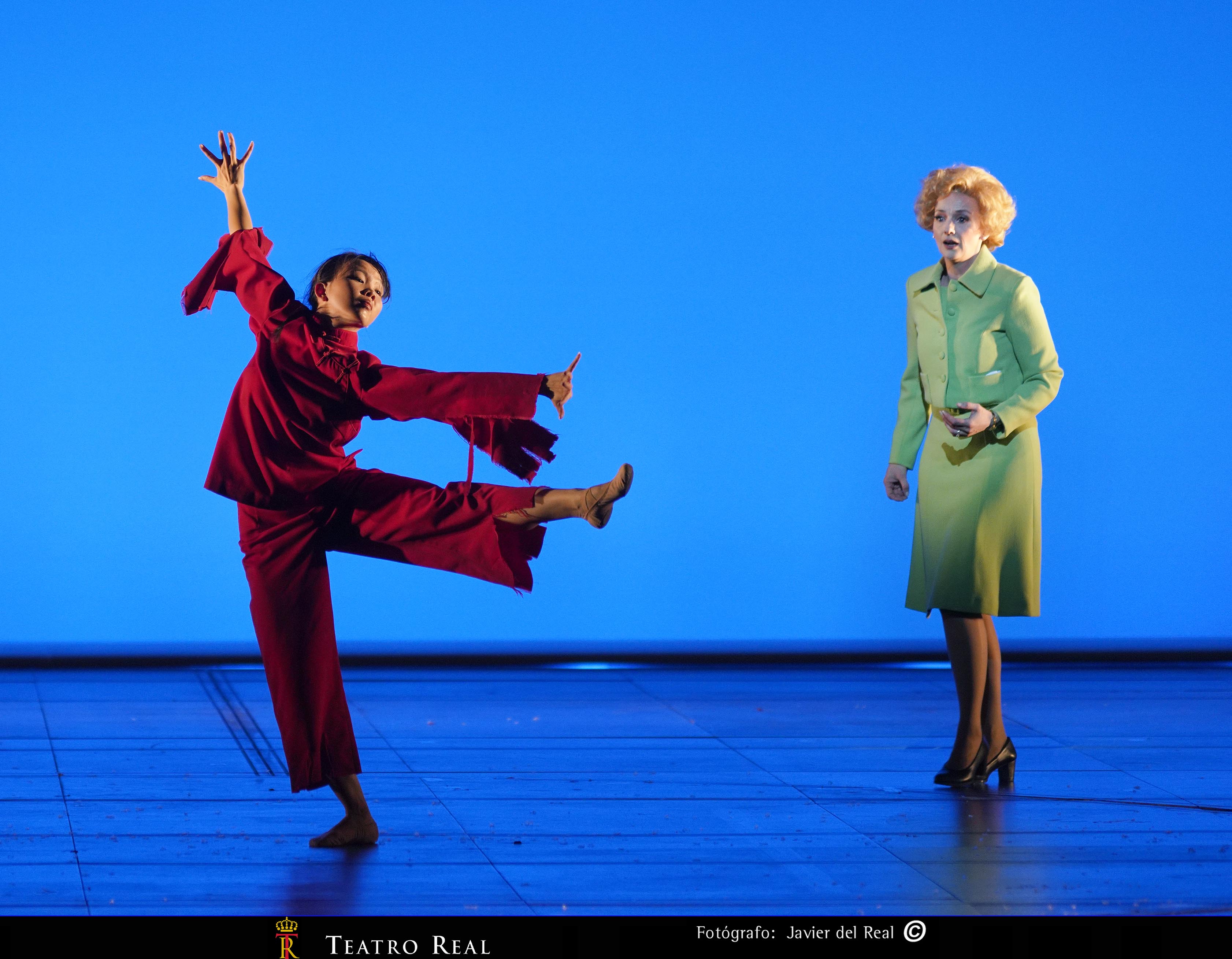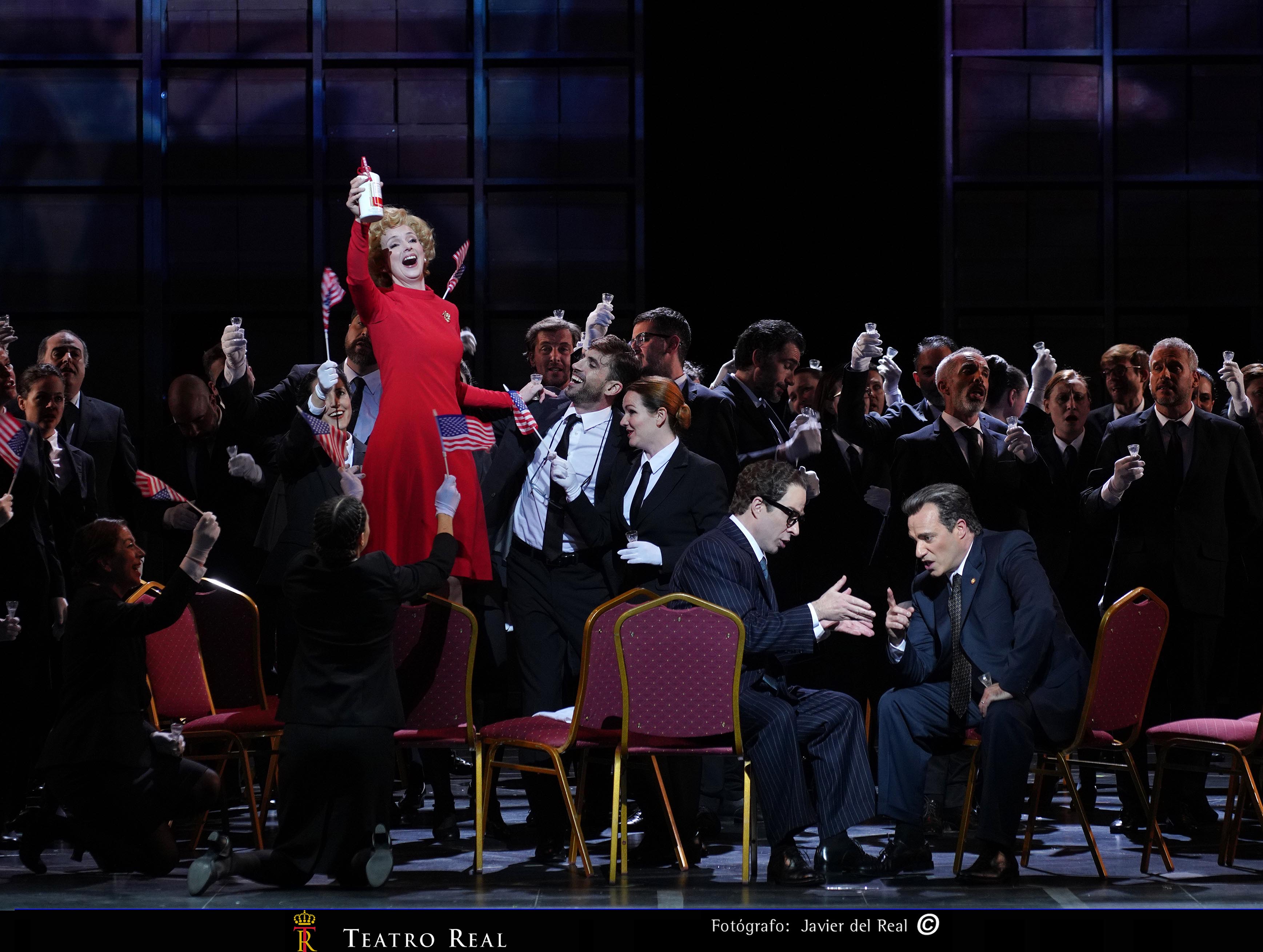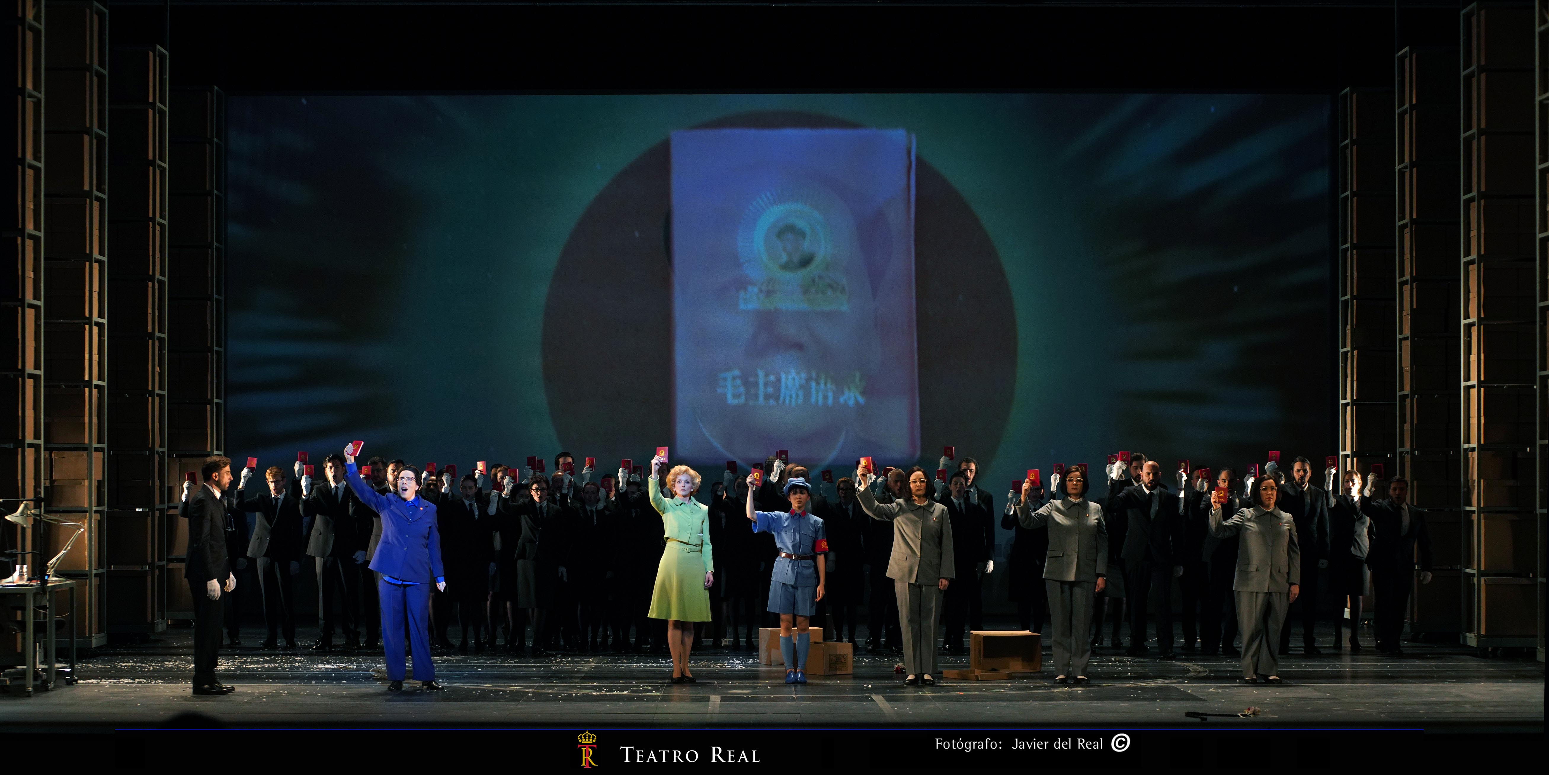 Nixon in China se estrena en el Teatro Real en coproducción con Den Kongelige Opera de Copenhague y la Scottish Opera, con espléndida dirección musical de Olivia Lee-Gunderman y con espectacular dirección escénica de John Fulljames, que utiliza material documental y gráfico cedido por la Fundación Richard Nixon y del Museo Richard Nixon que se proyecta continuamente en pantallas distribuidas por el escenario y que dan al montaje, aparte de un sentido funcional, un gran empaque visual y que recurre también a elementos circulares (mesas presidenciales y plataformas giratorias, como el globo terráqueo que seguía en vilo estas reuniones) para dotar de dinamismo a la acción y que ayuda a hacer una lectura de la ópera en clave mundial y global. En cuanto al reparto, muy equilibrado, destacaron el coreano Alfred Kim en el papel de Mao y la inglesa Sarah Tynan como Pat Nixon. Y fueron de menos a más Leigh Melrose (Nixon), Borja Quiza (Kissinger), Jacques Imbrailo (Chou-En-lai) y Audrey Luna (con una tesitura insuficiente para las prestaciones de coloratura que exige el personaje de Chiang Ching). Muy bien el coro titular del Real y la coreografía de John Ross.