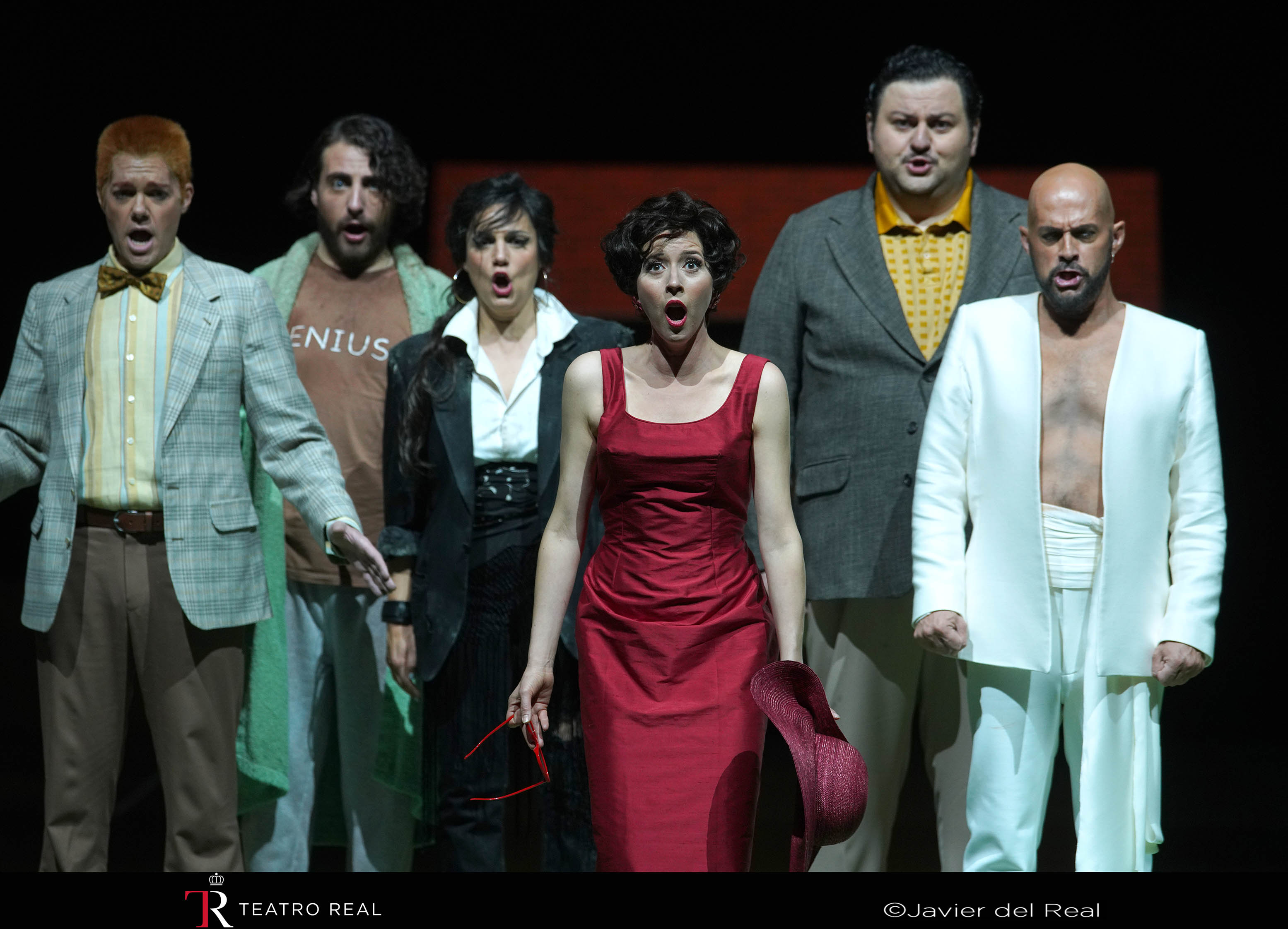 Al frente de la orquesta (y del fortepiano) se sitúa el joven y prometedor director Giacomo Sagripanti, que viene destacando en los últimos años en el repertorio belcantista y que dotó a la orquesta de un maravilloso sonido rossiniano. Y lo mismo el coro (de gitanos, encajado con calzador como un pegote kitsch ya desde el libreto de Romani, pero de eso no tiene la culpa Pelly) muy bien concertados, como de costumbre, por Andrés Máspero. En cuanto al reparto vocal, destacaron Lisette Oropesa (que ya cautivó al público del Real en 2018 con Lucia di Lammermoor), a la que le va como anillo al dedo el role del terremoto napolitano Fiorilla, Florian Sempey como el poeta-demiurgo Prosdocimo y el Don Geronio, apropiado en lo físico, actoral y vocal, de Misha Kiria. Cumplieron el resto de personajes: Alex Esposito (Selim), Edgardo Rocha (Don Narciso) y Paola Gardina (Zaida).