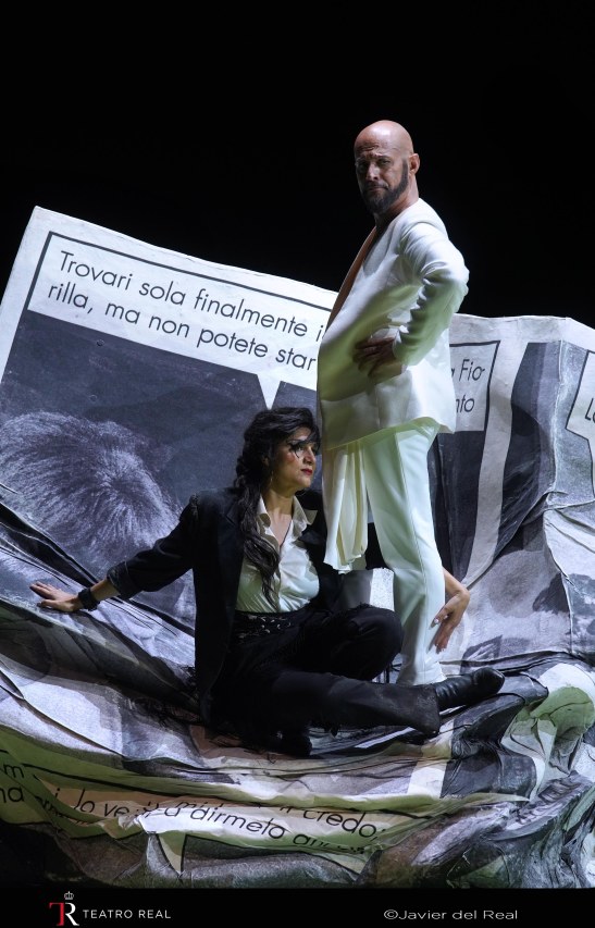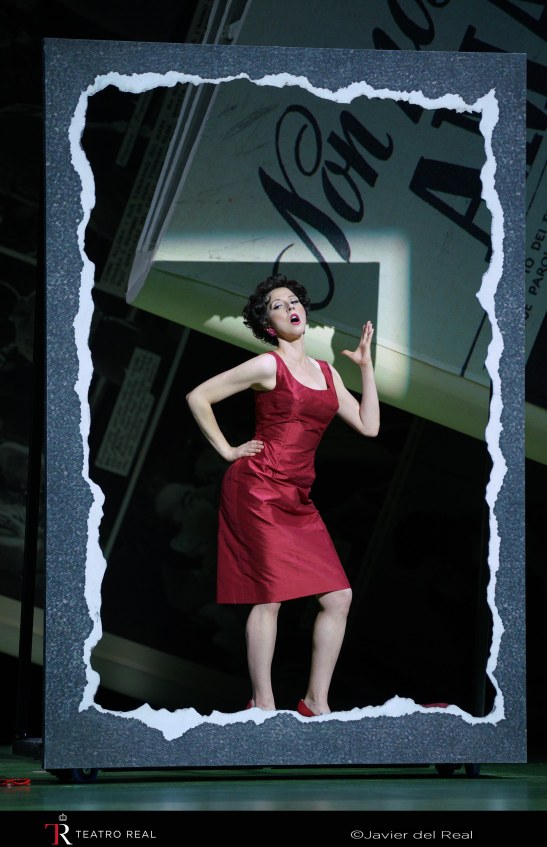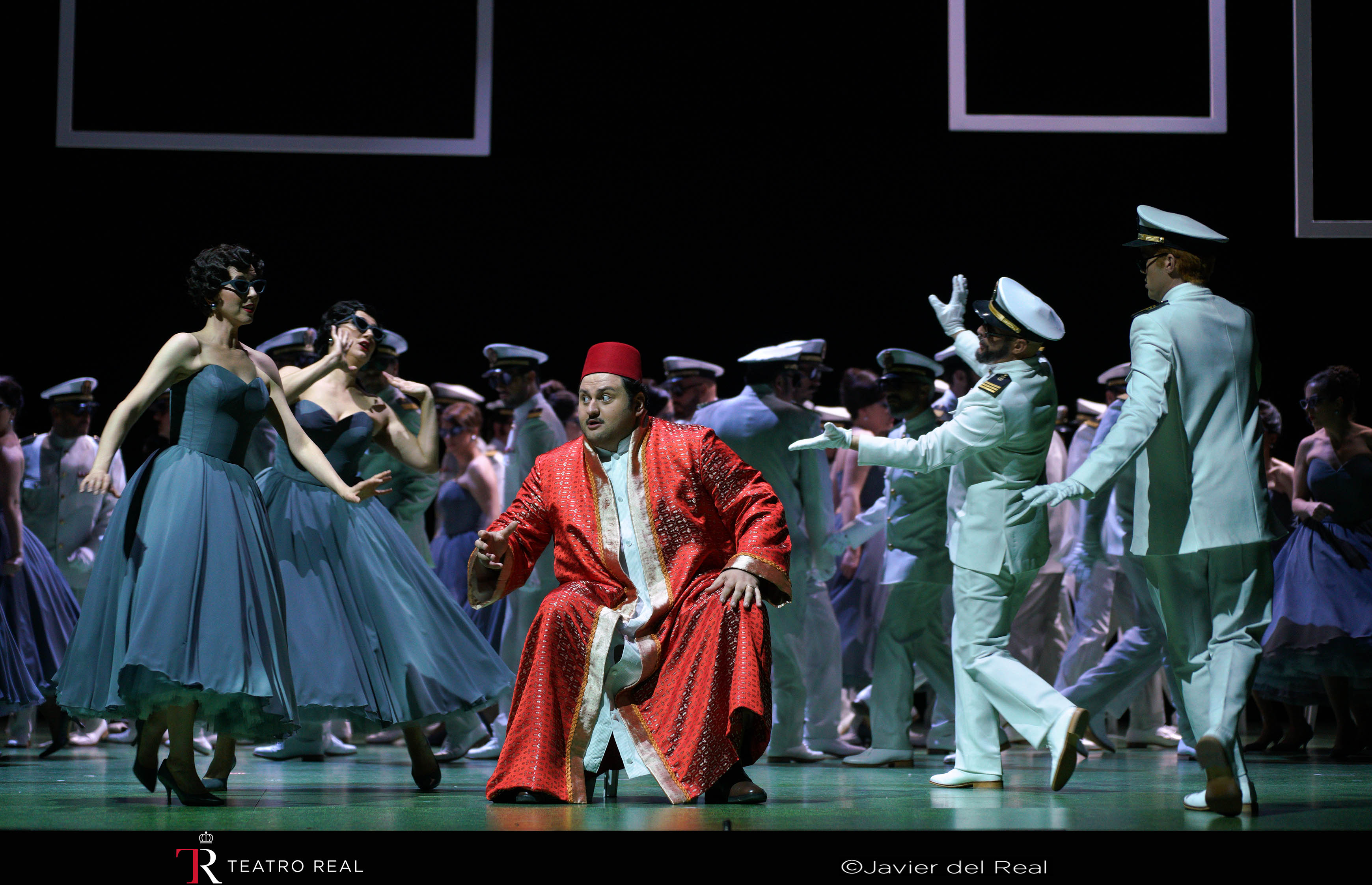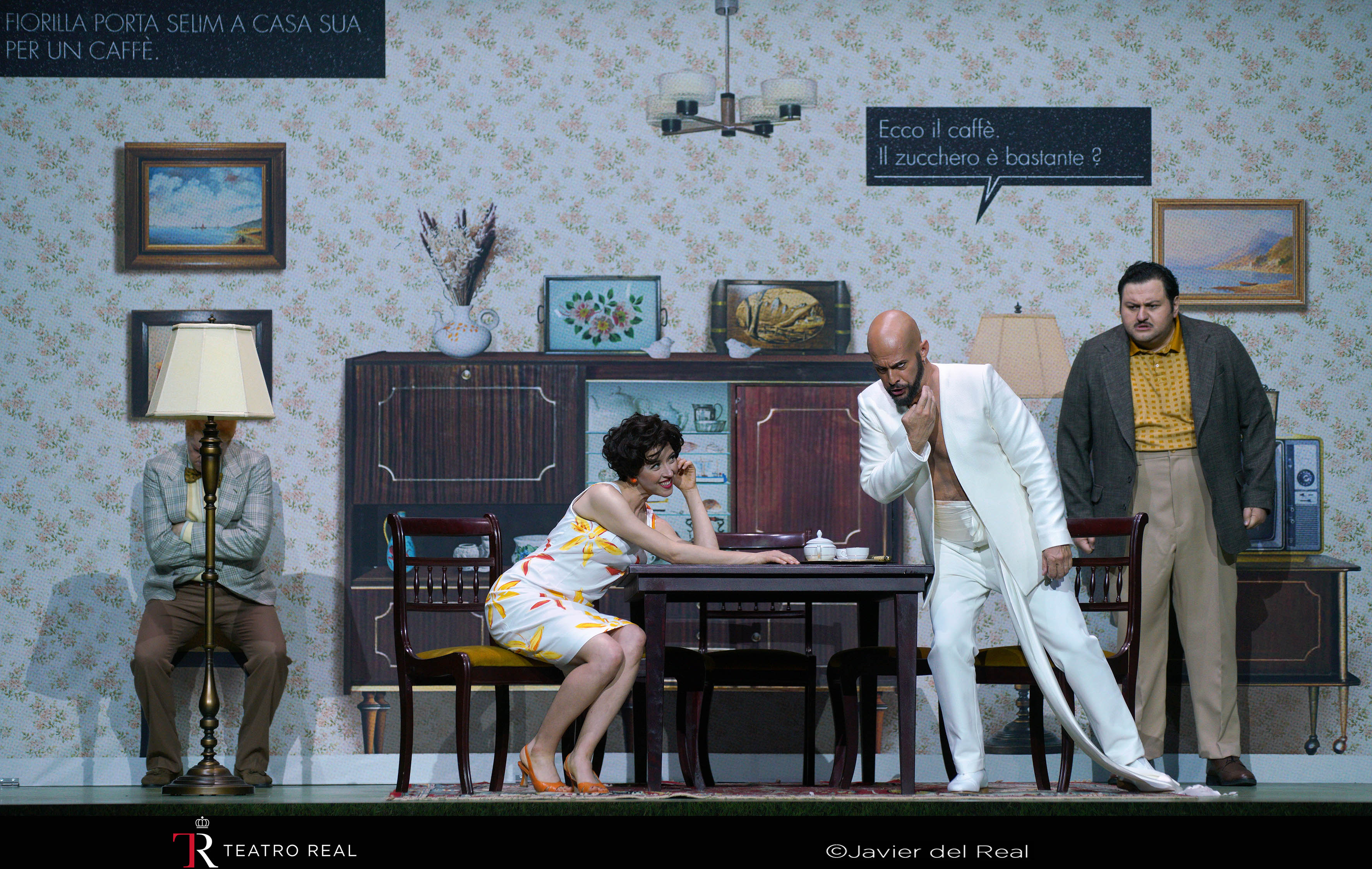 Aunque Il turco in Italia ya había sido representado en Madrid (aparte de su estreno en el Teatro de la Cruz de la Plaza del Ángel en 1818) en una deliciosa producción del Teatro de La Zarzuela de 1990 con dirección del especialista Alberto Zedda y un reparto de campanillas (Cuberli, White, Dara, Lopardo, Rinaldi…), el Turco viene a vernos por primera vez al Teatro Real en coproducción con la Ópera de Lyon y el New National Theatre Tokyo. Laurent Pelly repite en el coliseo madrileño tras Viva la mamma! de Donizetti y, sobre todo, Falstaff de Verdi, donde demostró que se mueve con soltura en el mundo de la ópera bufa. El regista francés traslada la trama de la ópera a los años cuarenta en Nápoles, donde la pizpireta y fantasiosa Fiorilla imagina como escapatoria a su insatisfecha vida matrimonial una apasionada historia de amor con Selim, un atractivo turco. El poeta (que es a la vez libretista y uno de los caracteres principales de la obra) Prosdocimo, necesitado de inspiración para su comedia, aprovecha para su nueva obra este argumento con sus personajes incluidos, a los que atrapa, maneja y manipula, aunque sea Fiorilla, en palabras de Manuel Fraga, «una heroína cómica de una modernidad asombrosa… Es astuta, lista, manipuladora, seductora, muy divertida y de arrollador encanto femenino», la que controle finalmente el devenir de la historia. Pelly aprovecha la estética vintage y los códigos de los seriales y las fotonovelas, muy en boga en la Italia de esos años, como sus poses y posturas estereotipadas, los encuadres móviles o los decorados fotografiados en blanco y negro o color que acentúan la sensación de voyerismo para el espectador: un diseño vistoso y atractivo aunque a veces tienda a la exageración de ademanes y a una sobreactuación de los personajes (en lo que se conoce ahora como postureo), por no hablar de las exigentes prestaciones físicas que en ocasiones incluso rozan el riesgo para su integridad. Quizá sean demasiadas lecturas (tres: la trama lineal, la que recrea el personaje de Prosdocimo y la del universo de las fotonovelas que construye Laurent Pelly) para que el espectador no se pierda y desconecte por momentos.