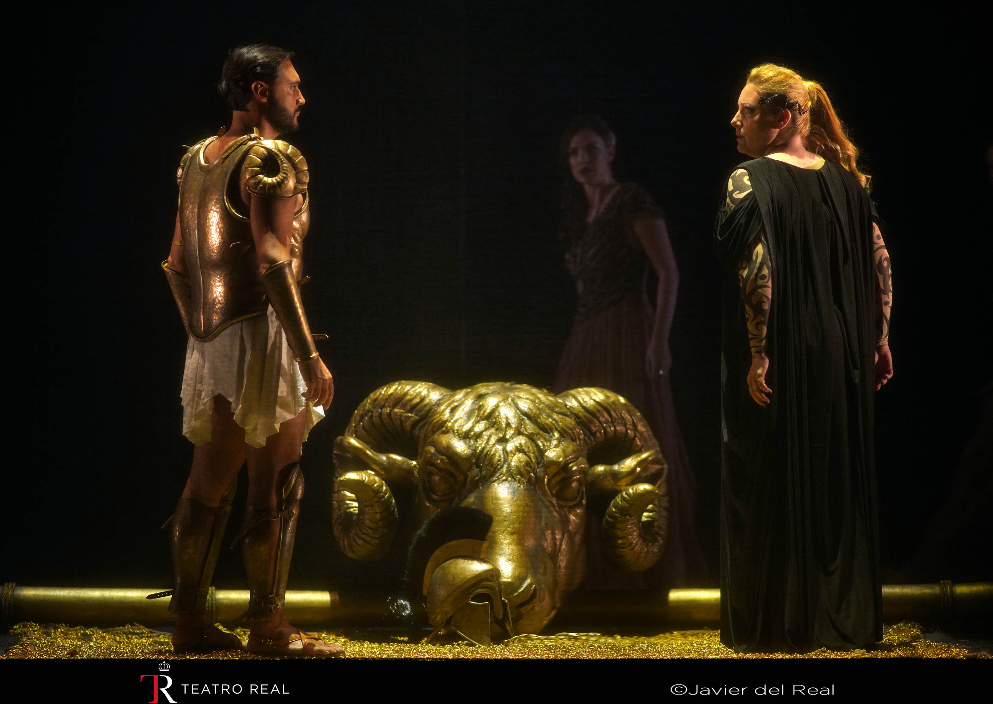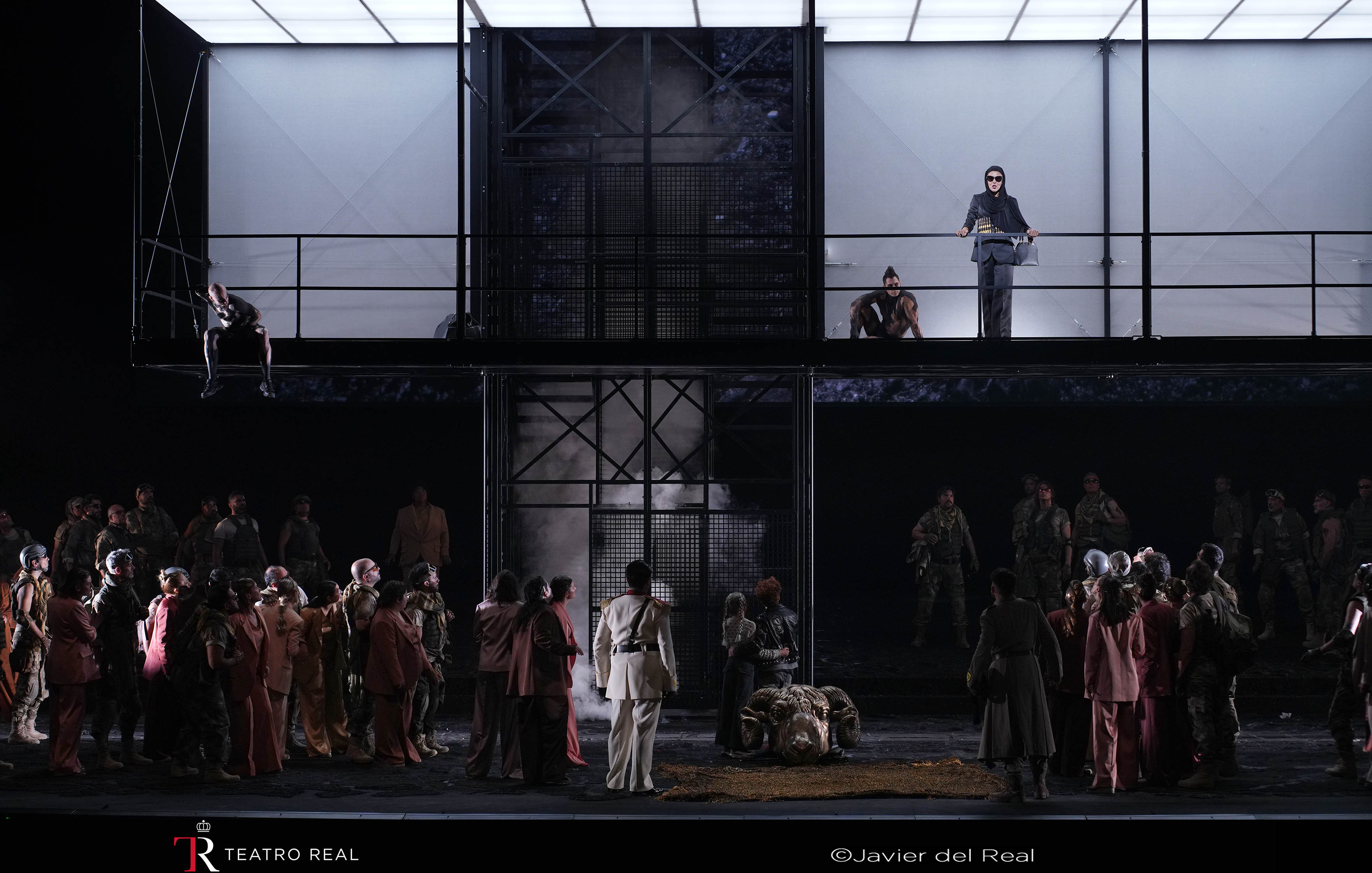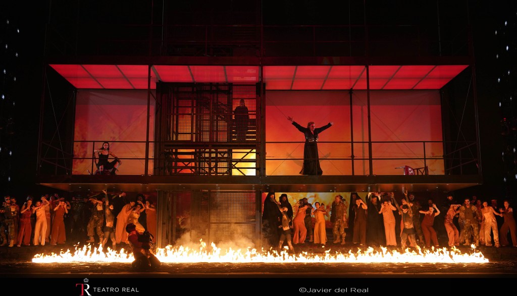 En cuanto a la dirección artística, a cargo de Paco Azorín, asistimos a sus ya clásicos carteles que separan los actos de la ópera y que resumen y aclaran el argumento (y también ponen el acento, aprovechando la trama de la ópera, en la lacra que supone la violencia vicaria, doméstica o intrafamiliar… que no sólo hay que ocuparse y preocuparse de la viogen). Pero en una confusión de estilos (lejos del hieratismo y minimalismo que pide este arcaico mito universal), el escenario se llena tan pronto de uniformes marineros (es Creonte… no Pinkerton), paramilitares (los argonautas) y de antidisturbios (la guardia real), de túnicas de fariseos (es Medea… no La vida de Brian), atuendos de raperos para los hijos de Medea (ésta luce de negro… ¡con gafas de sol y hasta ataviada con un cinturón de explosivos!) y Jasón (con un capote de anarquista ruso prerrevolucionario), como de bailarines de confusas e incluso ridículas coreografías (esa «fiespijama» de las doncellas de Dircé en Corinto…). Sin perder de vista la aparatosa plataforma metálica central (del estilo de las que podemos encontrar en los intercambiadores de autobuses y metro), provista de escalera y ascensor por los que suben y bajan los protagonistas y que, sólo al final de la ópera, muestra su utilidad dramática: Corinto, en la parte inferior del escenario, arde en llamas asolada tras la atroz venganza desencadenada por Medea, que se eleva triunfante, acompañada de su ejército de mortíferas erinias, llevándose los cadáveres de sus hijos (a los que, afortunadamente, Azorín nos ha ahorrado ver morir gracias al acertado empleo, de nuevo, de la plataforma como si fuera un tabique que nos tapa la horrible visión), mientras Jasón queda solo y condenado a errar eternamente.