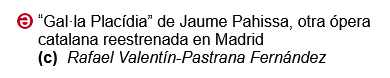 Con Gal·la Placídia / Gala Placidia (1913) de Jaume Pahissa (1880-1969) son ya cuatro las óperas de grandes compositores españoles nacidos en provincias de Cataluña que, para ser conocidas por el gran público, han tenido que ser recuperadas por el Teatro de La Zarzuela de Madrid (La dueña de Roberto Gerhard en 1992, Marianela del propio Pahissa en 2020 y La Celestina de Felipe Pedrell en 2022) y todas ellas muchas décadas e incluso siglos después de su concepción. En concreto, Gal·la Placídia había tenido sus primeras representaciones en enero de 1913 en el Teatro del Liceo de Barcelona (¡en italiano!) y posteriormente en el mismo teatro barcelonés, ya en su versión original en catalán, en febrero de 1933. Y hasta hoy. En 2019 se supo, por boca de Maria Eulàlia, hija del compositor, que recibieron «de Argentina un día la partitura de “Gala Placidia” y fuimos a llevársela a Joan Matabosch, entonces director artístico del Liceo. La perdió». Venturosamente, cinco años después, el milagro ha sobrevenido y la segunda de las cinco óperas de Jaime Pahissa apareció y se reestrena en edición crítica de José Miguel Pérez Aparicio, Juan de Udaeta y Enrique Amodeo. Evento que, aunque sea en versión de concierto, se canta en catalán por primera vez desde aquel lejano 1933 por obra y gracia, para desgracia de algunos, del Ministerio de Cultura de España y del Teatro de La Zarzuela de Madrid. Resulta que un emblema de la causa como Jaume Pahissa no había conseguido encontrar, desde su fallecimiento hace más de cincuenta y cinco años, a ningún catalanista de los muchos que proliferan a la sombra del dinero público que se tomara el interés de representar su ópera. Como canturreaba con nostalgia el Gobernador de la ópera Don Gil de Alcalá de Manuel Penella, de nuevo «¡Fue en Madrid! («¡Tierra maldita de todos los pecados!» apostillaba su confesor)… ¡Fue en Madrid!… ¡Fue en Madrid!». No sería de extrañar que, viendo lo bien que se han acogido en «Madrit» Marianela y Gal·la Placídia, también se terminen reestrenando en la capital de España las tres óperas de Pahissa aún pendientes de reposición: Canigó (1910), La morisca (1919) y La princesa Margarida (1928).