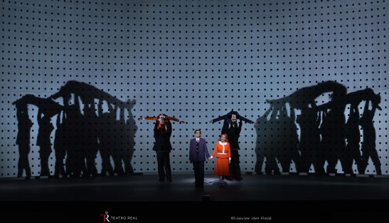 Lo más destacable de la puesta en escena de Guth es el acertado juego con las sombras, que sugieren las duplicidades de los protagonistas, en referencia al doppelgänger (el doble, el gemelo malvado, el que camina al lado) que presagia la muerte, como han ilustrado grandes poetas y músicos alemanes del movimiento estético Sturm und Drang. La escenografía de Christian Schmidt combina acertadamente, a través una plataforma giratoria, las dos estéticas que idea Guth: el mundo real del palacio de Mitridate, con diseño y mobiliario de finales de los años cincuenta y el mundo del subconsciente de los personajes, con sus sueños, sus complejos, sus miedos y sus fantasmas: un limbo dominado por un muro curvo de color gris. Olaf Winter, a cargo de la iluminación, proyecta un eficaz engranaje de sombras que ofrece momentos muy conseguidos, como el regreso de Mitrídates a su patria, el aria de Aspasia que cierra la primera parte, con una impactante iluminación cenital que va descendiendo hacia la protagonista o la escena de la muerte final del rey de Ponto, con las alargadas sombras de sus dos hijos cerniéndose sobre él. El vestuario de Ursula Kudrna, de diseño retro, juega hábilmente con el fuerte contraste cromático escogido para las vestimentas de los tres personajes femeninos de la ópera: morado para Sifare, verde para Ismene y naranja para Aspasia. Ivor Bolton, a pesar de no contar entre sus virtudes la de la elegancia de gestos, trata siempre de mimar con sus manos a la orquesta, que le sigue con disciplina y agradecimiento por las temporadas -ésta la última- compartidas, demostrando su acostumbrada eficacia en estos repertorios, mientras que la coreografía de Sommer Ulrickson insiste en la moda de recurrir a incomprensibles movimientos espasmódicos, aunque el riguroso vestuario negro de los encapuchados bailarines, junto a sus ominosas sombras, provoca logrados momentos de inquietud y desazón. La dramaturgia de Konrad Kuhn nos deparó el mejor momento de la función: el aria de Sifare «Lungi da te mio bene», una de esas mágicas conjunciones de texto, decorado, vestuario, iluminación, coreografía y movimiento escénico (brillante la idea de sacar al trompa Jorge Monte del foso para ejecutar su parte, mientras recorre el escenario interactuando con los personajes y meciéndolos con su melodía, hasta que abandona la sala abrazado a la soprano) como sólo en la ópera pueden darse, y durante la cual el tiempo pareció detenerse.