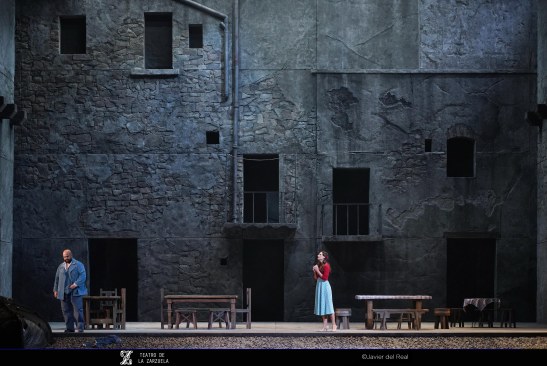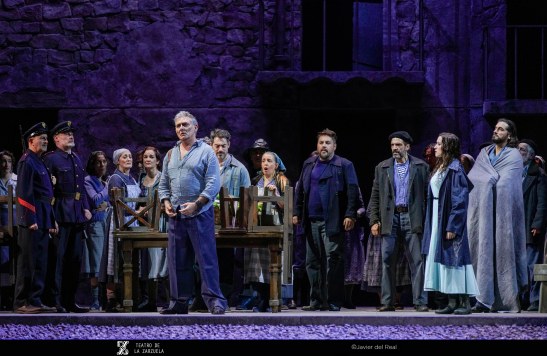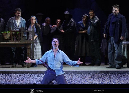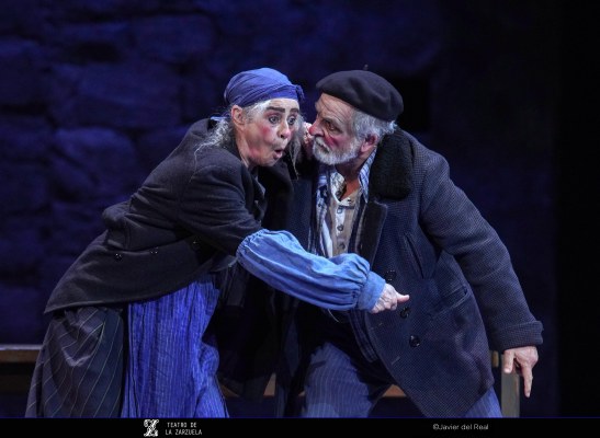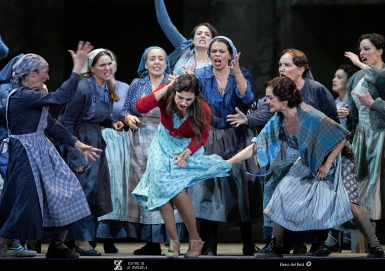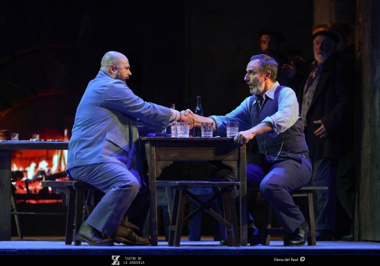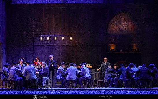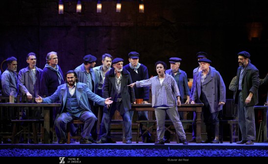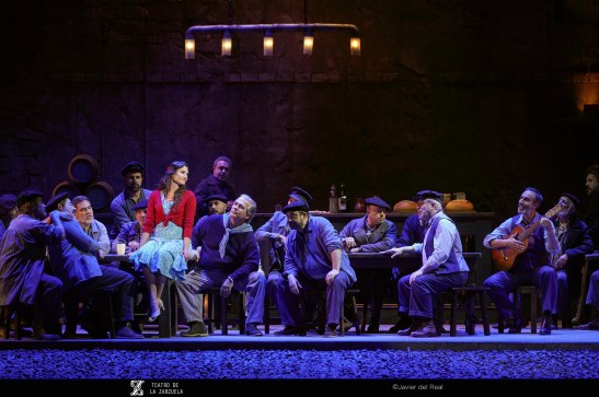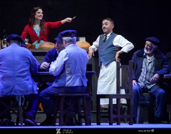 La versión de La tabernera del puerto que se representa estos días en el coliseo de la calle Jovellanos es reposición de la que se escenificó en 2021 y en esta ocasión contó con eficaz dirección artística de Mario Gas (vinculado desde siempre a esta zarzuela: su padre Manuel interpretó el papel de Simpson en el estreno madrileño de 1940), escenografía de Riccardo Massironi (retomando y enriqueciendo los materiales de Ezio Frigerio, fallecido en 2022: especialmente destaca el interior de la taberna de Marola, aunque su distribución, con la barra al fondo, con los clientes por en medio, oculta las intervenciones de Marola y Juan; tampoco convence en canalillo de agua situado en la boca del escenario, que simula el mar Cantábrico y en el que algunos de los personajes chapotean de forma ridícula); sencillo pero eficaz vestuario de Franca Squarciapino dominado por los tonos negros, grises y azules tan representativos de las gentes del mar, salvo la distintiva rebeca roja de la protagonista Mariola; videoescena de Álvaro Luna (que juega un papel esencial en la secuencia de la galerna, el momento más conseguido de la puesta en escena de Mario Gas) e iluminación de Vinicio Cheli (deslumbrante el interior de la taberna, de grandeza casi catedralicia). Julio César Picos, a la batuta, obtuvo muy buena respuesta de la orquesta, siempre dinámica, aunque en algunos momentos entregada en exceso, como cuando en el inicio del segundo acto la energía de los instrumentistas impide escuchar con claridad al coro.