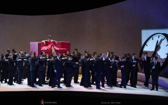 Llega ahora La traviata al Teatro Real en producción de la Dutch National Opera & Ballet y dirección de Willy Decker. Los tres actos de La traviata están presididos por un omnipresente reloj que marca el inapelable paso del tiempo hacia el fatídico desenlace que ya se nos anuncia desde el mismo preludio inicial de la ópera. Un planteamiento, el de la cuenta atrás, que no alcanza la fatalidad que Paco Azorín consiguió en su montaje madrileño de Tosca en 2021 y que termina por parecer, por obvio y redundante, que estamos contemplando La cenicienta en vez de La traviata. Reloj aparte, lo parco del diseño escénico de Wolfgang Gussmann termina distanciando al espectador por su escueta concisión tanto en el continente (no se distinguen los cuatro decorados donde transcurre la ópera: el apartamento de Violetta, la casa de campo de la pareja, el palacio de Flora y el dormitorio de Violetta comparten la misma pobreza escénica) como en el contenido: sólo encontramos cinco sofás (lisos, de skay y estampados con flores de cretona) mal contados y una bancada semicircular en la que los protagonistas se sientan como si esperaran la llegada del último metro. Para la partida de cartas que precipita la tragedia en la mansión de Flora6, el reloj de marras incluso hace de mesa de juego. Desde luego, lo que haya costado este elemento de atrezo, se ha amortizado con creces. Poco ayuda para el desarrollo de la ópera el tratamiento que le ha dado Decker al personaje de Alfredo: apocado, inseguro, titubeante, desubicado, precipitado, superado por las circunstancias, ninguneado, ridiculizado y humillado por nobles, por su padre, incluso por Violetta y zarandeado y vapuleado por todos como un títere y un pelele. También es discutible la decisión de, en las tres primeras escenas del segundo acto, hacer visible a Violetta (jugando con su amante a algo que parece el escondite en calzoncillos y combinación), cuando en el libreto sólo aparece en escena Alfredo y, luego, la criada Annina para confesarle que viene de vender las posesiones de la señora de la casa, obviamente sin que ésta esté presente.