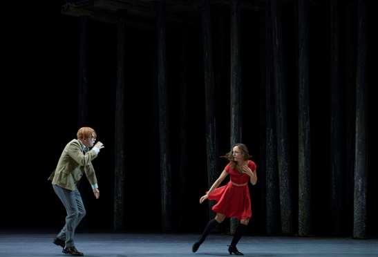 La figura del Poeta prologuista, presente tanto en el ballet como en la ópera, funciona a medias (por mucho que Joan Matabosch también intente justificar esta decisión de Christoph Loy): una voz en off o simplemente unos rótulos hubiera resuelto la situación más eficazmente que hacer interactuar de manera absurda a este personaje en las dos obras: en el Mandarín el Poeta (personaje inexistente en el relato de Lengyel) acaba subido a la cabina y en Barbazul (que es donde los autores sí incluyeron un prólogo) termina deambulando sin sentido entre los pilotes de madera de la playa, siendo testigo pasivo (tampoco existe ese personaje en el texto de Balazs: sólo es un prólogo literario) de la reclusión final de Judith tras abrir la última puerta. La agresividad de la trama está, eso sí, bien resuelta en algunos momentos del ballet (los sórdidos intentos de ahogamiento del mandarín, primero con una bolsa de plástico y luego sumergiendo su cabeza a la orilla de la playa) y lo mismo se puede decir del uso de distintos colores chillones (rojo, morado, amarillo mostaza…) en los ropajes de la prostituta y sus explotadores. Lo que no resulta fácil es imaginarse a un mandarín luciendo esmoquin. Menos inspirada está Barbara Drosihn con el vestuario de la ópera de Bartok, en la que Barbazul y Judith visten modelos como si estuvieran volviendo comatosos de una fiesta de Nochevieja: ahí se impone la consabida dicotomía blanco-negro tan típica de Loy: dominio de los negros (pertinentes para mimetizarse con la oscuridad que marca el libreto) en los ropajes de la pareja, salvo con el contraste del blanco de la camisa de Barbazul.