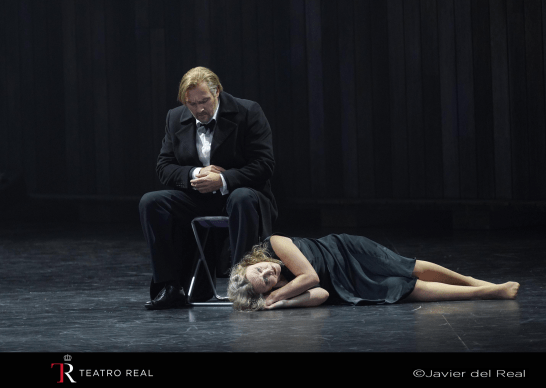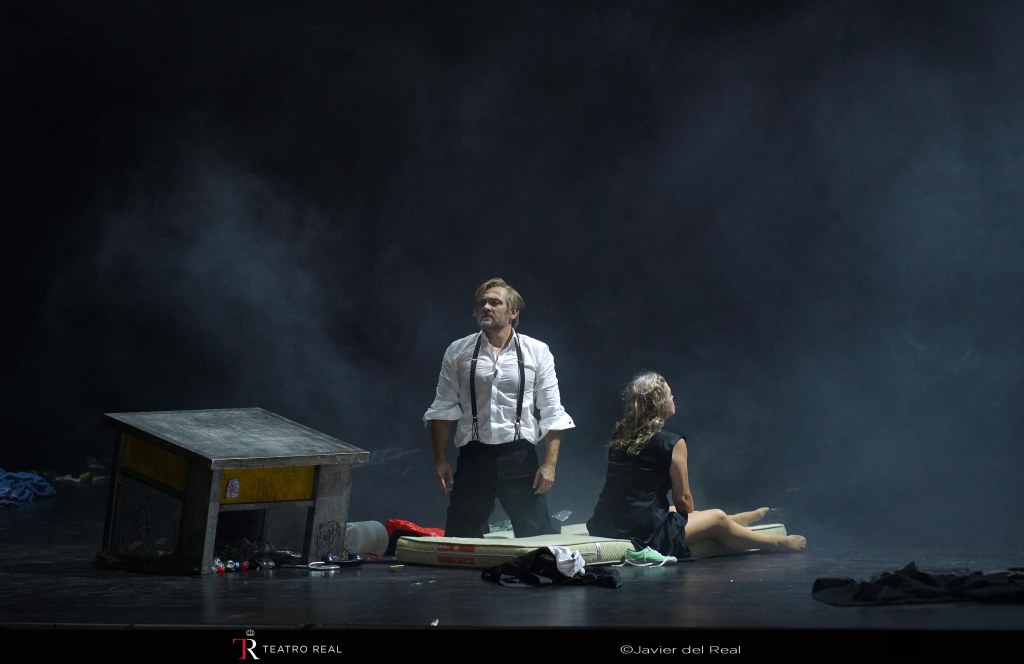 La actual producción, que ya se representó en Basilea en 2022, cuenta con la dirección escénica de Christof Loy, que redunda en sus obsesiones particulares ya conocidas de su larga colaboración con el Teatro Real (Capriccio, Rusalka, Arabella, La voz humana, Eugenio Oneguin): ese gusto por los amplios y casi desnudos espacios y por la radicalidad cromática. Y esa inconfundible querencia al tumulto lujurioso, especialmente presente en la caótica coreografía del Mandarín, también responsabilidad de Loy. El mensaje que pretende transmitir el director es algo confuso: el final de El mandarín maravilloso encadena con otra acción en El castillo de Barbazul, pero en el mismo lugar. Sobre los cimientos del decorado del Mandarín emerge el castillo de Barbazul y así ambas obras quedan unidas en una única dramaturgia. La violencia exterior que sufren los personajes del ballet da paso, sin solución de continuidad, a Judith violentando con su insistente curiosidad los sentimientos y secretos de Barbazul. Y por eso el mandarín y la ramera del ballet (interpretados con estajanovista entrega por los bailarines Gorka Culebras y Carla Pérez) “son” Barbazul y Judith en la ópera.