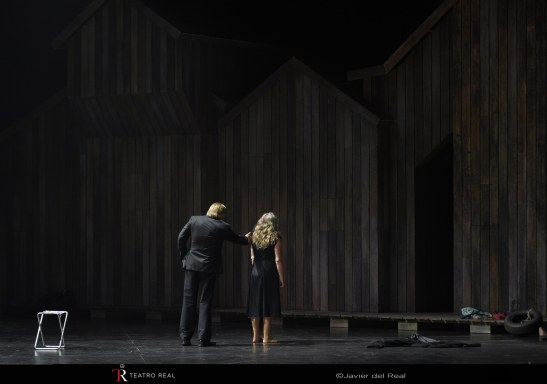 Christoph Loy se inclina por un tratamiento de la ópera de Bartok en clave simbólica y de psicoanálisis, de moda en los años en que ambas obras fueron concebidas. Pero una cosa es que el castillo sea una metáfora y otra que no haya castillo: lo que vemos son las afueras de la fortaleza y el espectador se queda a las puertas de la misma, en una explanada en la que se distribuye el escueto y feísta atrezo ideado por Loy y el escenógrafo Márton Ágh: casetas de playa (de hecho Loy aclara en sus notas al programa que la acción transcurre a las orillas de una) sobre postes de madera, sillas de plástico y de tijera, neumáticos y todo tipo de basura contaminante que parecen restos de una riada, aparte de la simbólica (aunque ni leyendo las notas al programa de Matabosch quede claro qué simboliza) cabina telefónica, visible por completo en el ballet y parcialmente enterrada en la ópera. A falta de haber dado al espectador la oportunidad de visualizar el interior de las salas del castillo de Barbazul (es una pena que no se haya recurrido, con la de posibilidades que hay hoy en día con las nuevas tecnologías, a ninguna imaginativa solución audiovisual que hubiera ilustrado todos los detalles que nos describe Bela Balazs) al menos el juego de brumas (acertada metáfora de las lágrimas del lago que se ocultan tras la sexta puerta, eficientemente conseguida mediante la siempre agradecida máquina de humo) y la iluminación (sobre todo, la atenuación gradual de la misma en la escena de la séptima última sala hasta sumir al escenario en una dramática oscuridad que, finalmente, se impone en su total fatalidad) de Thomas Kleinstück dan algo de prestancia al espectáculo.
